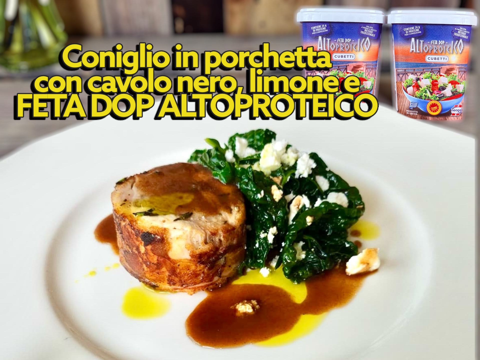 Ci sono piatti che nascono dal rispetto profondo per la materia prima e dalla voglia di raccontarla senza maschere. Questo Coniglio in porchetta con il suo fondo, cavolo nero, limone e feta DOP Altoproteico è esattamente questo: una ricetta che parla di tecnica, memoria e equilibrio.
